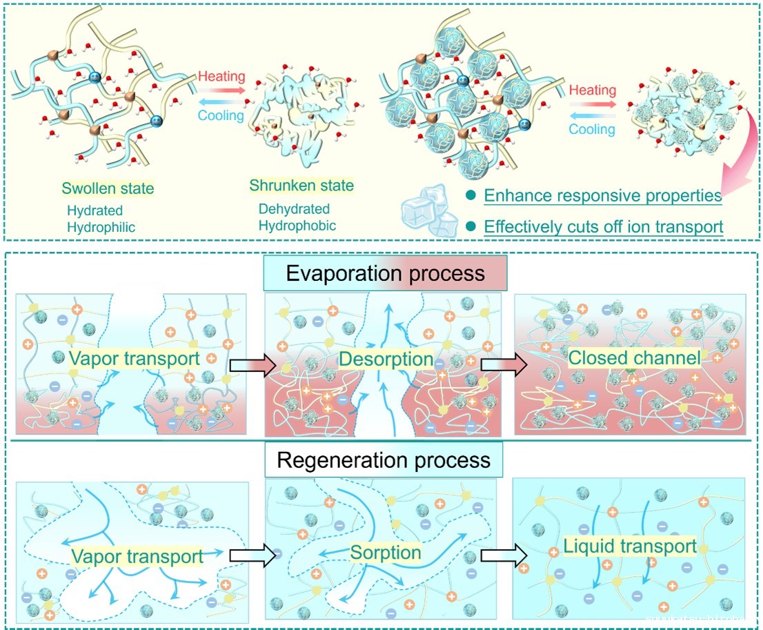 本研究通过调控亲水性与疏水性单体的比例,成功实现了对水凝胶电解质相转变温度的精准调节。该智能电解质通过构建“双重保险”热防护机制实现主动热管理。第一重防护由嵌入水凝胶基体的纳米微球与水凝胶网络协同作用,在温度升高时快速触发由亲水向疏水状态的转变,从而迅速关闭离子传输通道,有效响应热量积聚。作为补充,材料中水分的蒸发进一步阻碍离子迁移,构成第二重热保险。得益于水凝胶网络的热可逆特性,基质在冷却后能够恢复原有容量;同时,电解质具备良好的再生能力,可动态调节基体含水量,确保离子传输性能的稳定恢复。