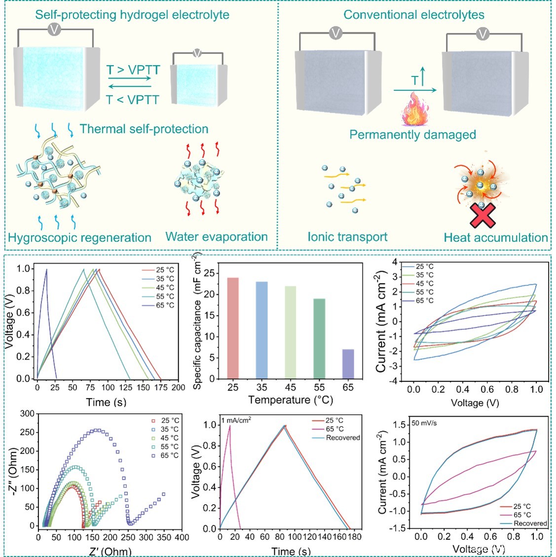 水凝胶电解质所组装的超级电容器可在无需外部干预情况下感知温度变化并自主调节。在25℃-65℃测试范围内,该超级电容器可在热响应行为触发后,通过可逆网络恢复原有的容量,出色的再生能力确保设备恢复其初始工作状态。