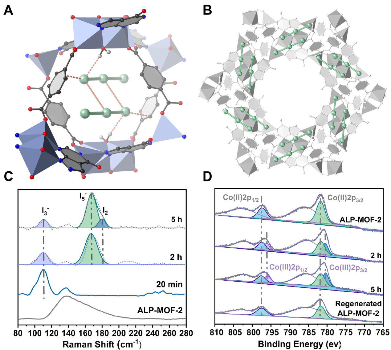 在ALP-MOF-2中,Co(II)的氧化导致吸附的I2被还原为I3−,并在持续的I2吸附过程中进一步形成I5−和I2。通过实验表征和理论计算,我们阐明了ALP-MOFs中金属离子及其组成对碘分子吸附机理。该机理与形成和控制不同碘聚集体的比例密切相关。